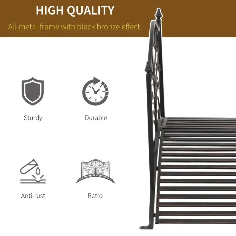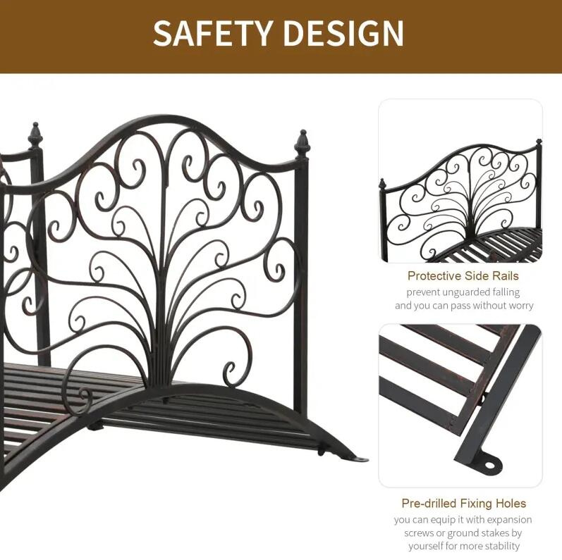 Crafted with a strong metal frame and finished with a durable epoxy coating, this bridge is built for long-lasting outdoor use. The arched silhouette provides a graceful profile, while the two side rails feature intricate scrollwork that adds sophistication and artistic detail to any garden setting. The black-bronze finish blends beautifully with natural landscapes and decorative themes, creating a stylish focal point for your yard.